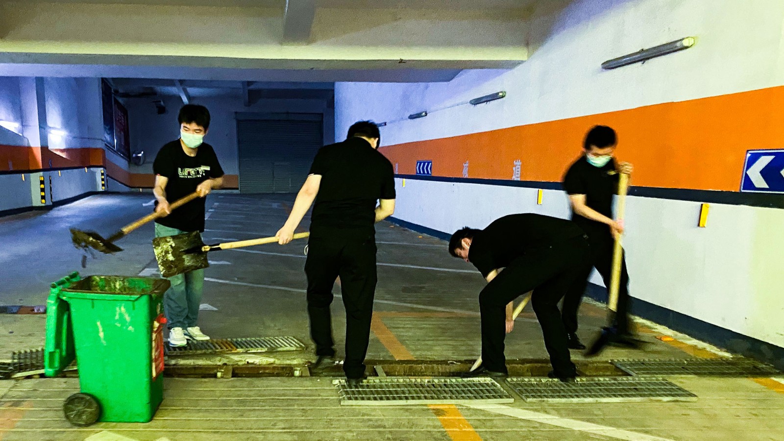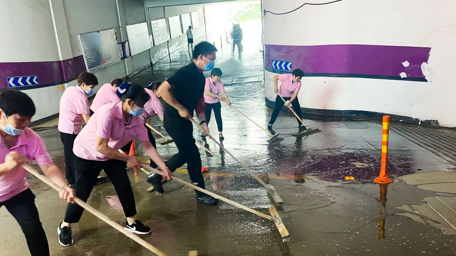 6月3號下午開始,廣場物業(yè)有序開展清掃行動(dòng),積極、細(xì)致、認(rèn)真地開展全面作業(yè),大家手拿掃把及沖洗水管,全身心地投入到大掃除中,齊心協(xié)力,干得熱火朝天,顧不上被水濺濕的鞋子與汗?jié)竦囊路踔劣谖飿I(yè)部副經(jīng)理張偉赤腳上陣,對頂部、管網(wǎng)、人防模塊等衛(wèi)生死角進(jìn)行揚(yáng)塵清理,清理刷洗之后又對排水溝槽進(jìn)行深度清淤。