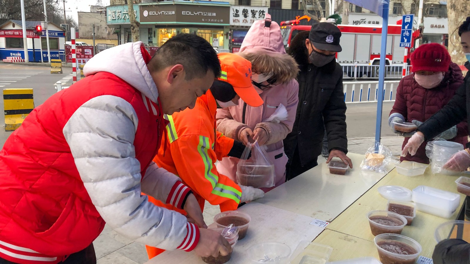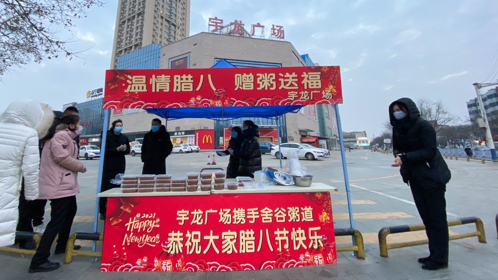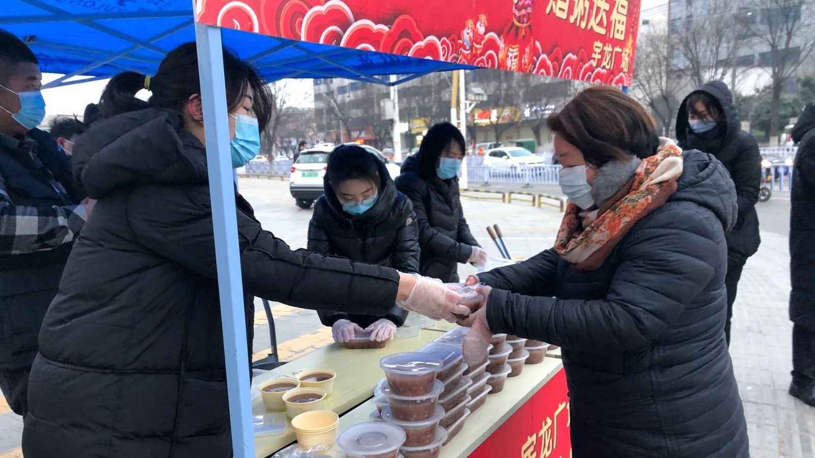 由于疫情防控的需要,為了防止人員聚集,工作人員提前把粥用餐盒打包好,寒風(fēng)中工作人員熱情地招呼過(guò)往行人品嘗一碗香暖四溢的臘八粥,讓大家能夠在寒冷的冬季感受到宇龍廣場(chǎng)的溫暖。與此同時(shí),楚總帶領(lǐng)工作人員將一碗又一碗的臘八粥送到附近執(zhí)勤的交警、環(huán)衛(wèi)工人手中,向冒著嚴(yán)寒的工作者表示慰問和感謝,讓他們一同感受越來(lái)越近的年味,感受來(lái)自宇龍廣場(chǎng)的關(guān)愛。