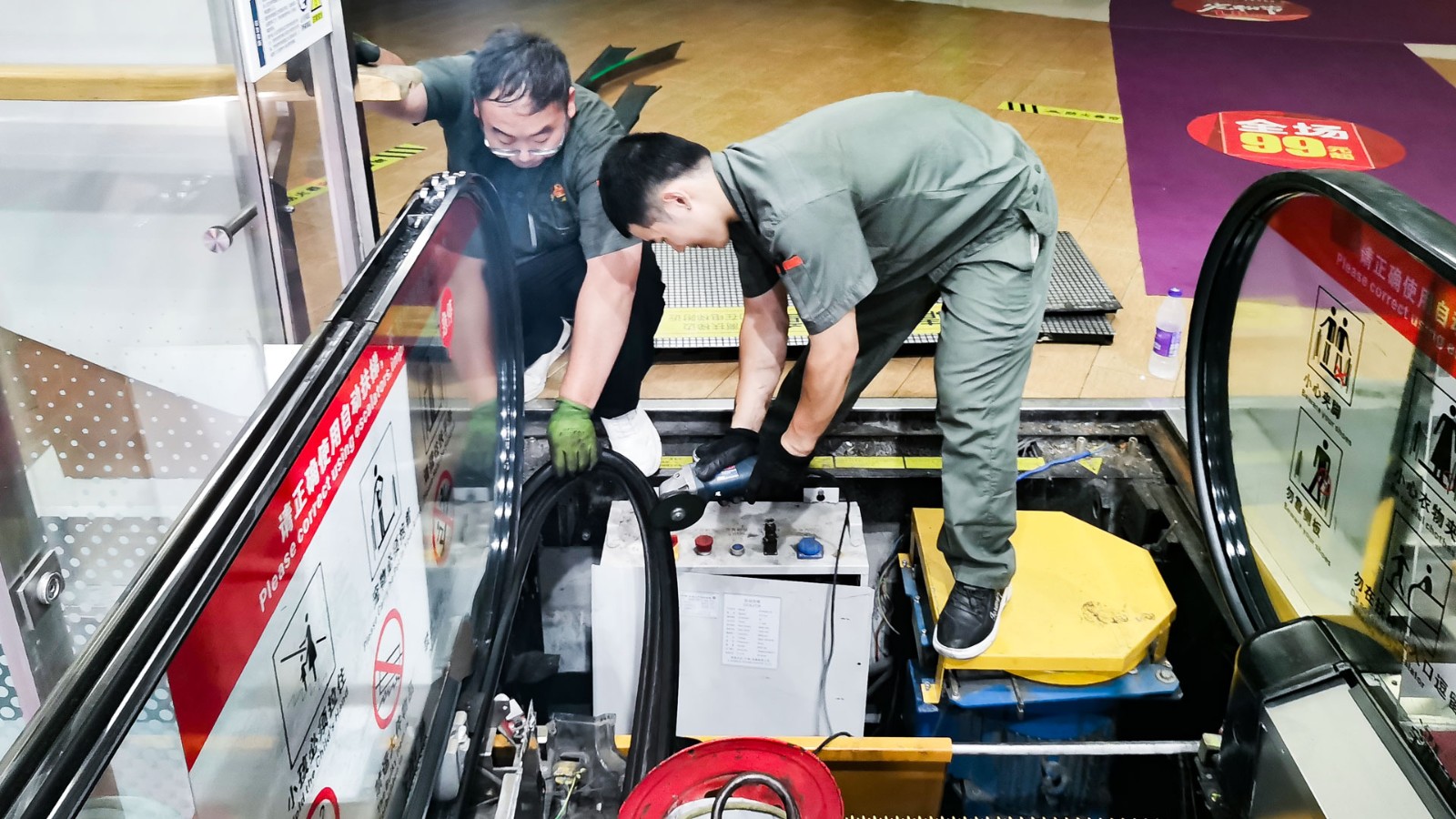 為了不影響廣場正常生產(chǎn)經(jīng)營,維修中心決定于廣場閉店后開始更換扶手帶。7月25日晚上10點,維保班組一行人員到達(dá)廣場南廳1樓便著手進行更換。維保人員分工明確,配合默契,首先將扶梯上下機房蓋板、梯級等拆下后,然后在做好各項安全防護工作后拆下磨損嚴(yán)重的扶手帶,隨后將近30米長的新扶手帶裝上。之后經(jīng)反復(fù)試驗,扶梯運行時已無異響。