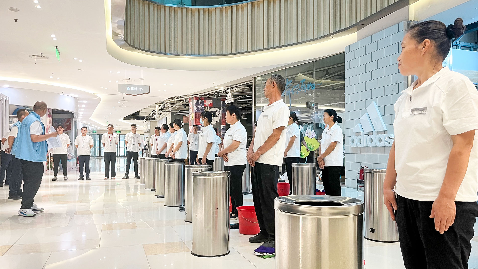 活動伊始,保潔科在一樓西廳組織進行垃圾桶清潔與套袋實操比拼,作為基礎但關鍵的服務環(huán)節(jié),簡單的套袋工作,在如何快速卡緊、避免松動等細節(jié)上有很多技巧。套袋的緊密程度和更換效率直接影響顧客體驗。此次跨崗位交流為安保人員提供了學習機會,也促進了服務流程標準的統(tǒng)一。